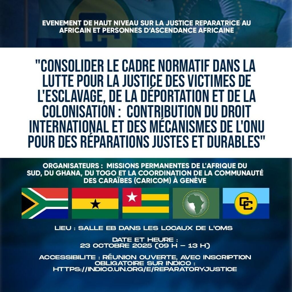 « Consolider le cadre normatif dans la lutte pour la justice des victimes de l’esclavage, de la déportation et de la colonisation : contribution du droit international et des mécanismes de l’ONU pour des réparations justes et durables » : c’est le thème de cet évènement organisé par le Togo en collaboration avec le Ghana, l’Afrique du Sud, la Coordination de la communauté des Caraïbes (CARICOM) et le Haut-commissariat des nations unies aux droits de l’homme.