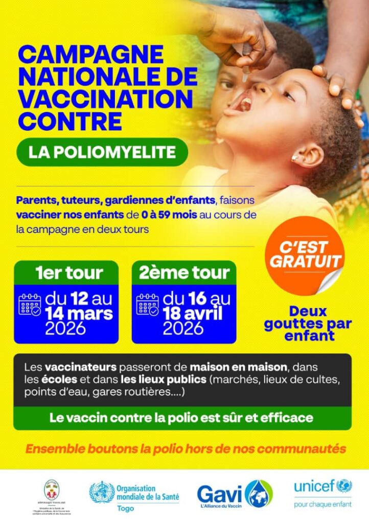 Le Togo lance une nouvelle offensive de lutte contre la poliomyélite. Le pays organise du 12 au 14 mars 2026, une nouvelle campagne de vaccination contre la maladie sur toute l’étendue du territoire.